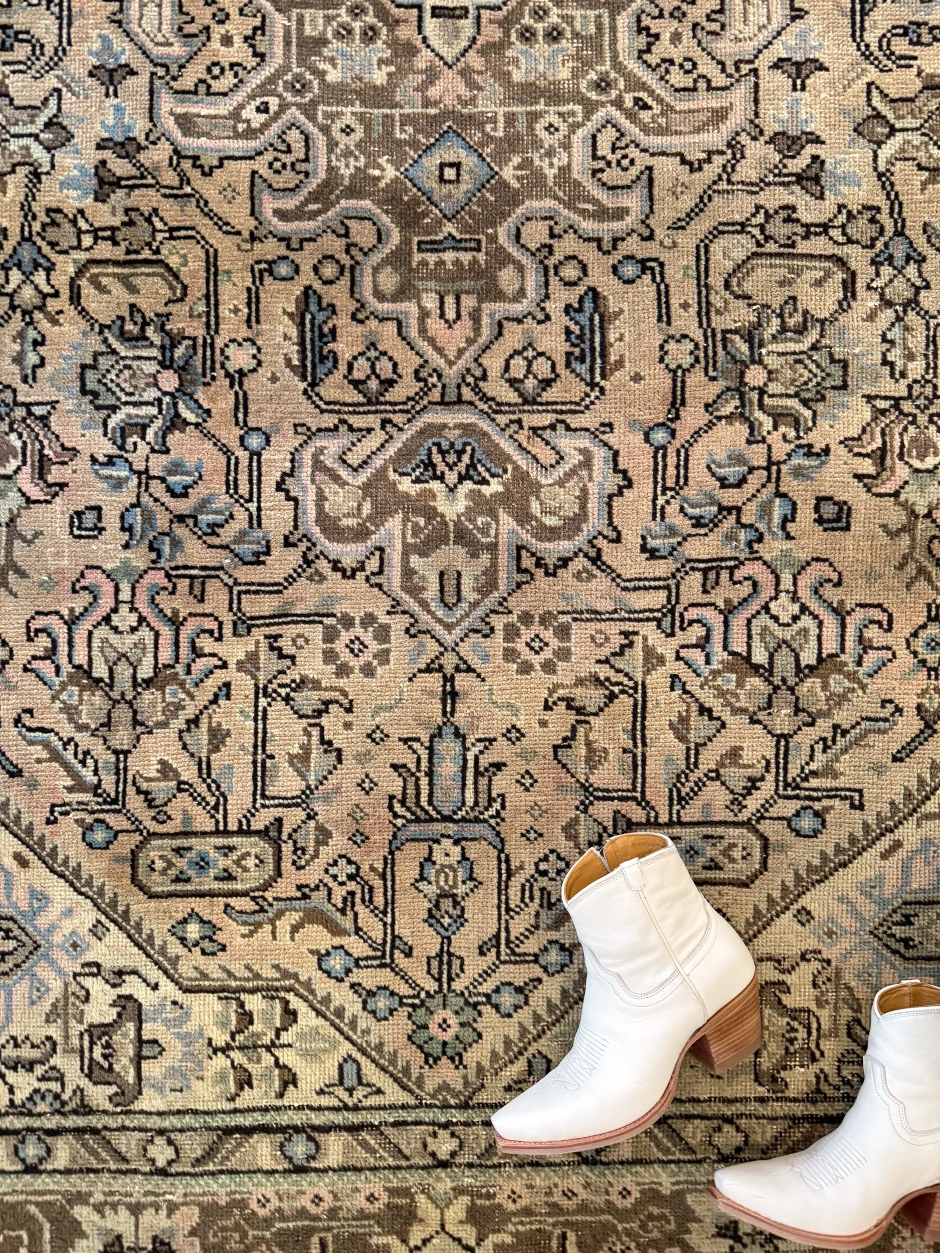 Laurelcrest Estate is a study in quiet grandeur that is rich in detail, yet softened by a restrained, neutral palette. A warm parchment field unfolds into a richly detailed medallion and scrolling botanical motifs, woven in tones of olive bark, muted sage, soft blush and sky blue. From afar, she reads neutral and composed but up close, the artistry reveals itself in delicate contrasts and finely drawn detail.