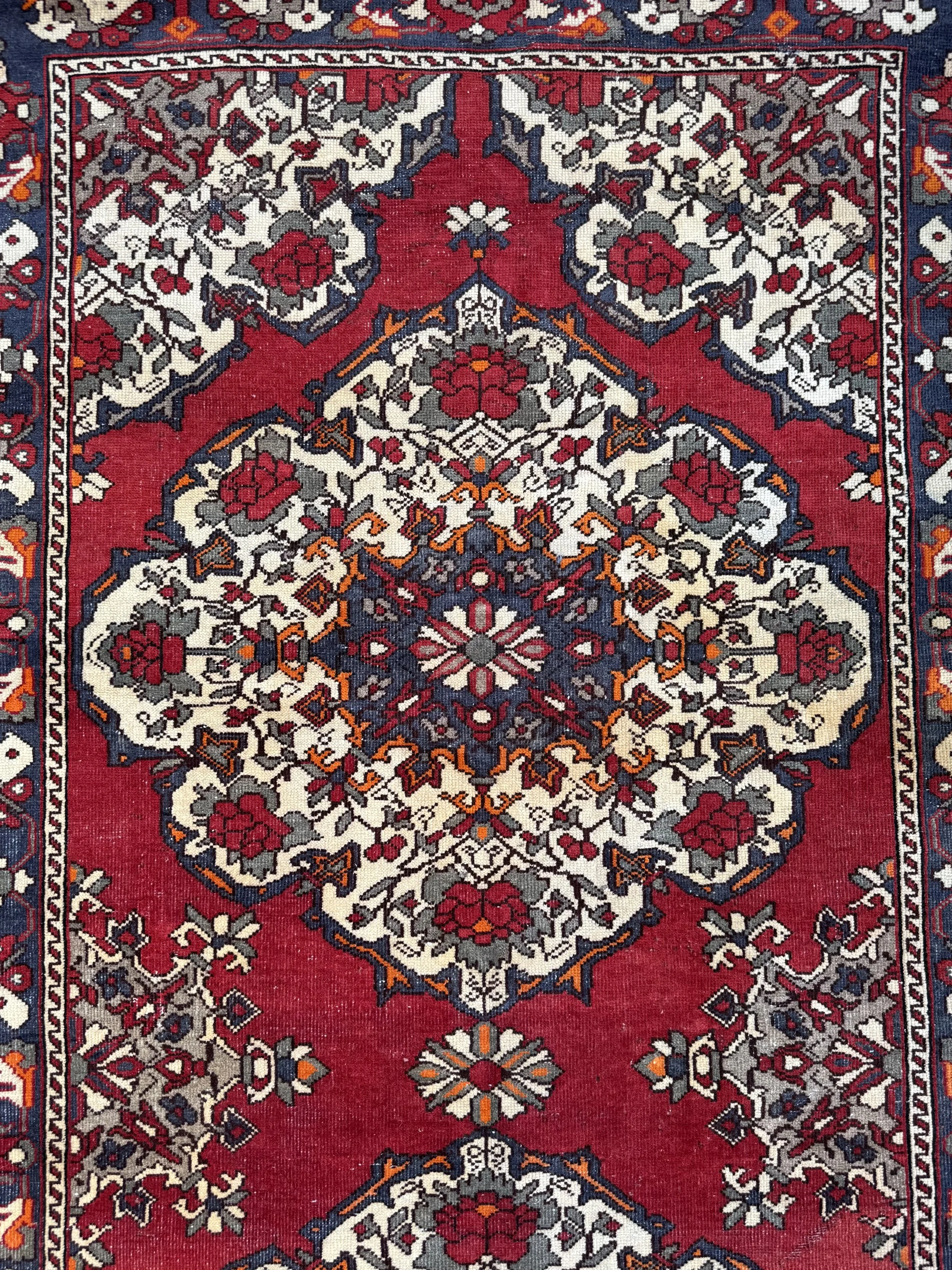 There’s a ripened beauty woven through Pomegranate Vineyard—a vintage Persian that feels both abundant and grounded. Its field glows with orchard reds and mulled-wine tones, anchored by diamond medallions that bloom like fruit at harvest. Each softened vine and petal motif seems to tell a story of time and craftsmanship, mellowed by years of tread and light.